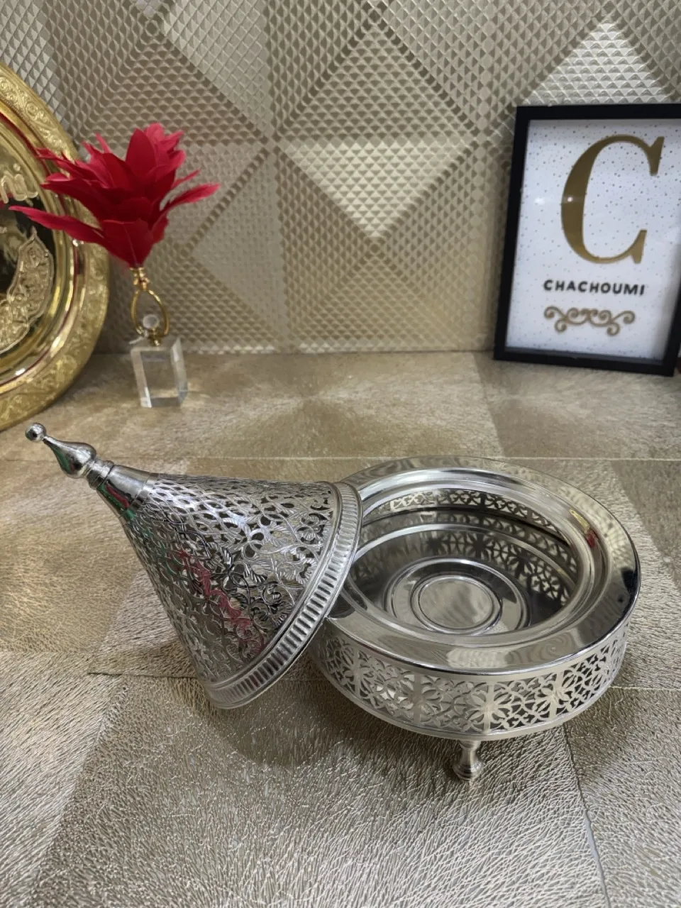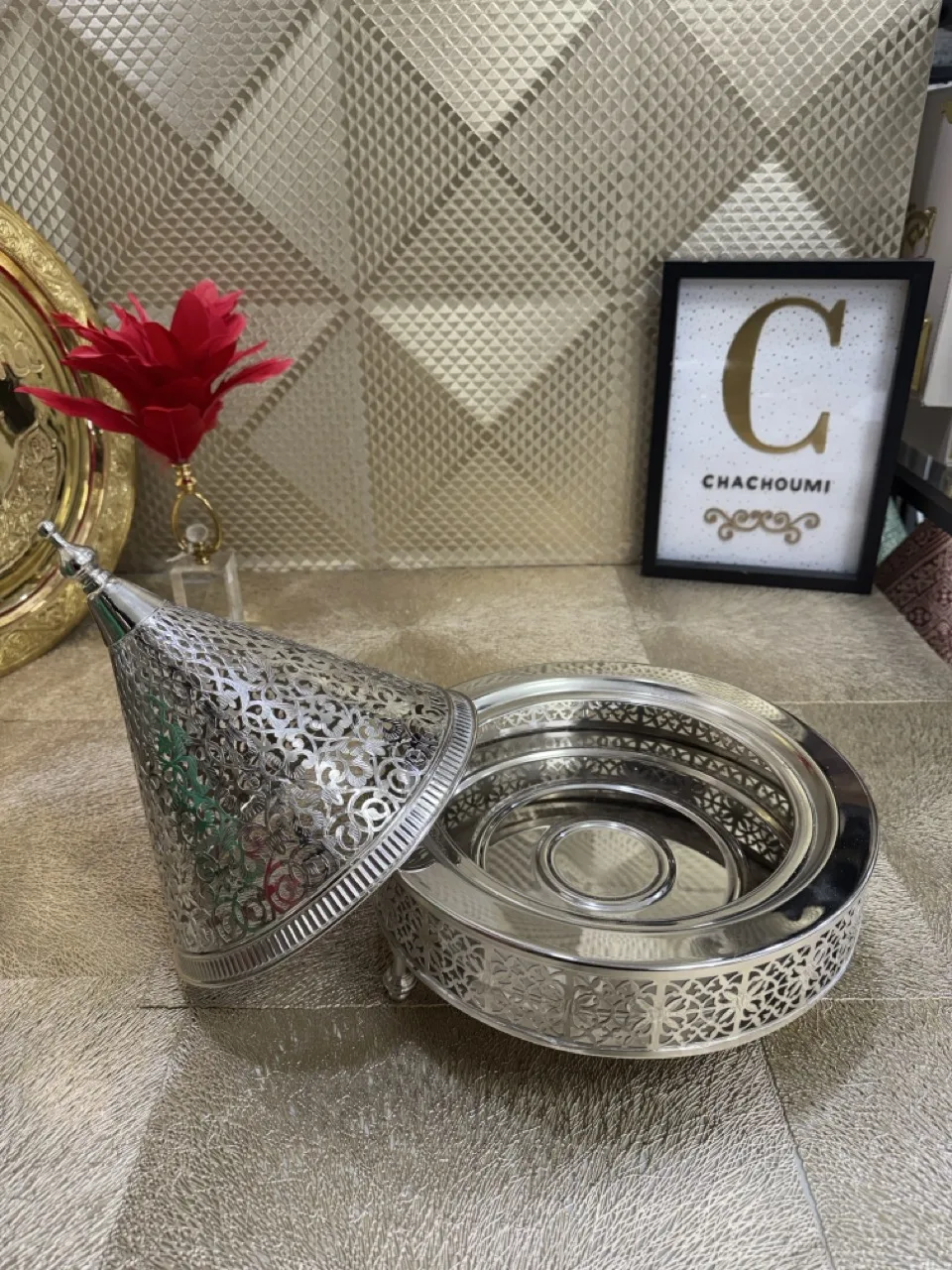 La décoration de mariage orientale comprend une variété d’éléments captivants tel que des lanternes en métal ciselé, des tapis persans aux motifs complexes, des tayfours artisanaux, sinya et des draperies luxueuses font partie intégrante de cette ambiance enchanteresse. Les couleurs chaudes telles que le pourpre, l’or, le rouge et le bleu royal sont souvent utilisées pour créer une atmosphère chaleureuse et opulente.